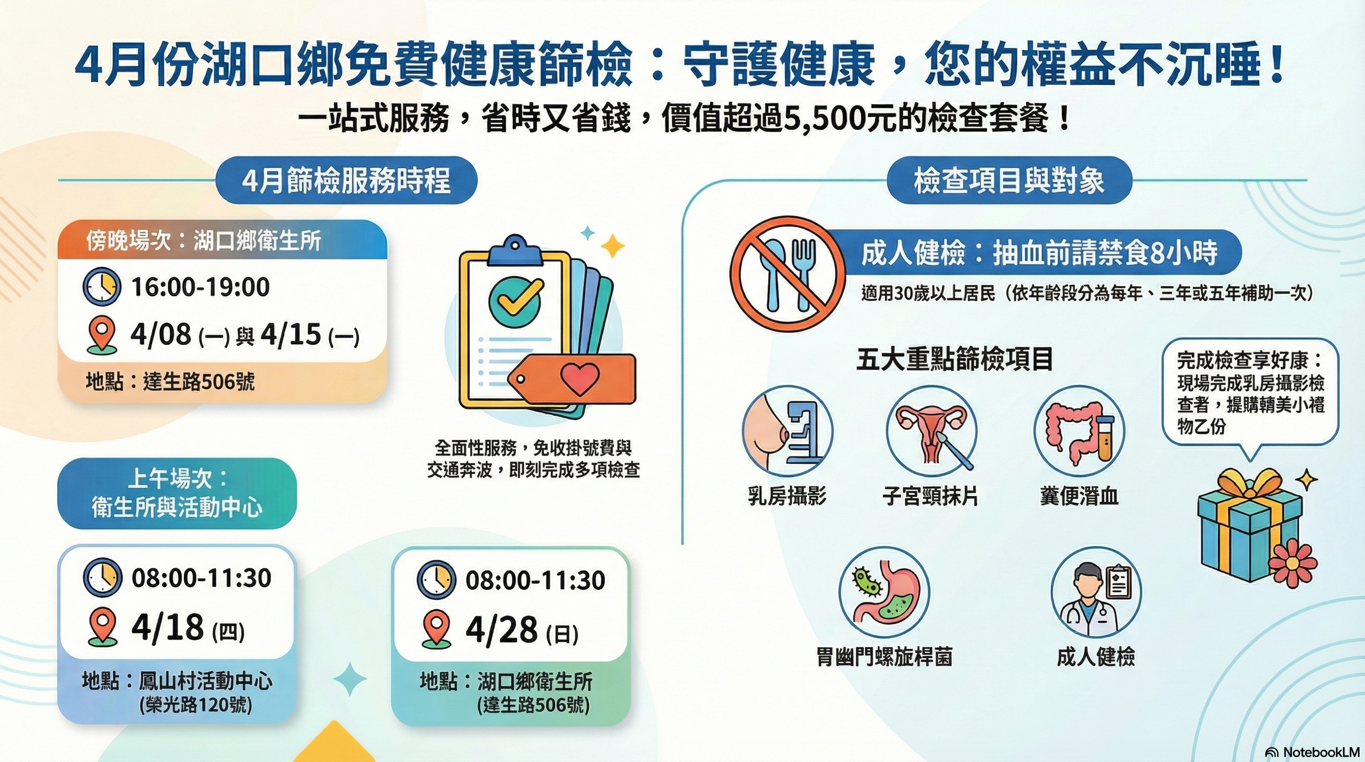 價值超過$5,500元的檢查套餐,這是一份關於您個人健康權益的重要通知。國民健康署提供多項「免費」檢查,如果您符合資格卻未受檢,等同放棄了政府給您的福利!為了幫您省去跑大醫院的掛號費與排隊時間,湖口鄉衛生所特別安排了「一站式服務」。只要跑一趟,就能把該做的檢查一次做完!