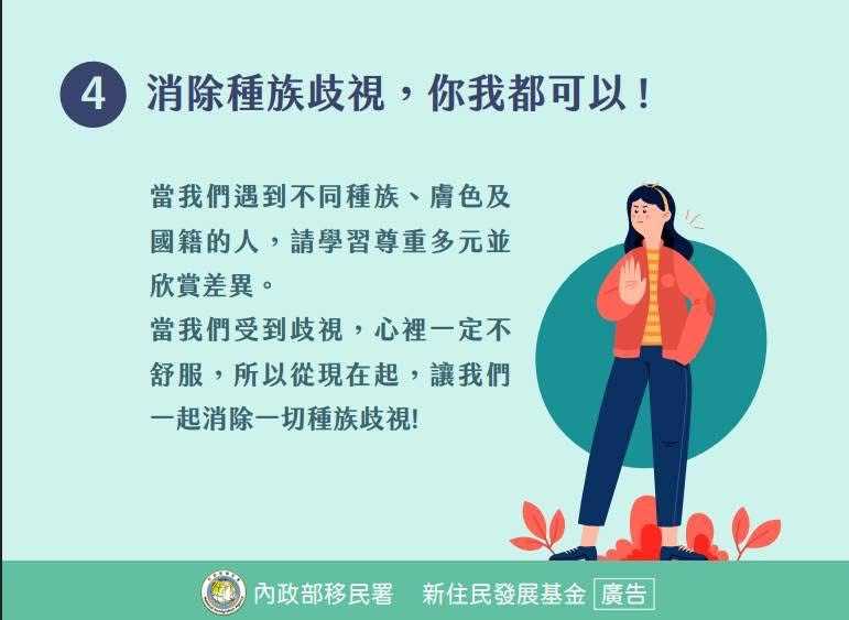 你知道嗎?臺灣也有禁止種族歧視的國際公約! 聯合國提出的「消除一切形式種族歧視國際公約」(簡稱ICERD)提倡人民不分種族、膚色及國籍,享有一切基本人權,積極消除種族歧視及不平等待遇 ICERD為臺灣退出聯合國前所簽署,已正式批准及生效,在國內具有法律效力,若遭遇歧視或不當對待,請撥打移民署「居住台灣地區之人民受歧視申訴專線」(02)23889393分機2581進行申訴諮詢,如需通譯服務請撥打1955。